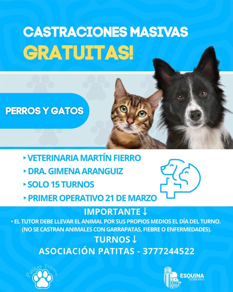 La Municipalidad de Esquina, junto a Asociación Patitas, inicia una nueva jornada de castraciones gratuitas para perros y gatos, promoviendo el cuidado responsable de nuestras mascotas y el bienestar animal.