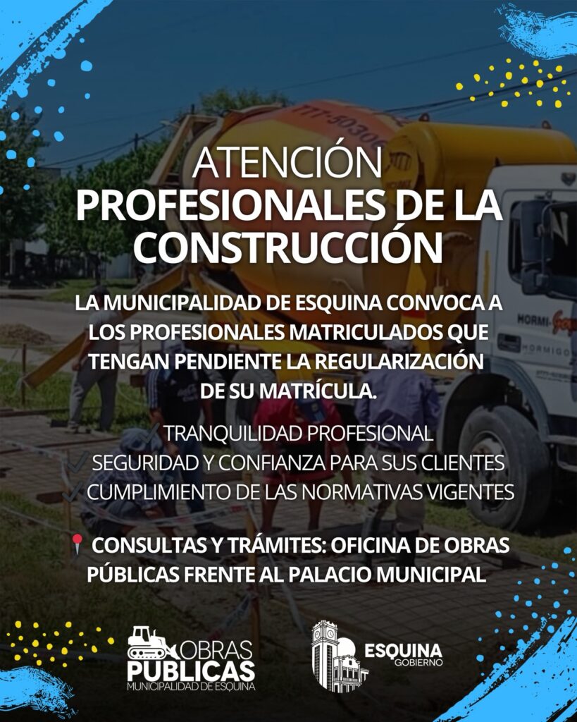 - Municipalidad de Esquina Atención Profesionales de la Construcción 22 enero, 202623 enero, 2026 Municipalidad de Esquina 0 comentarios La Municipalidad de Esquina continúa avanzando en acciones que promueven el ejercicio profesional responsable y el cumplimiento de las normativas vigentes en el ámbito de la construcción.