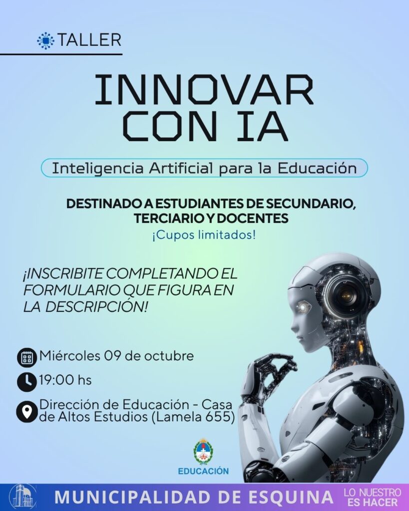 La Municipalidad de Esquina, a través de la Dirección de Educación, invita a estudiantes de nivel secundario, terciario y docentes a participar del taller “Innovar con IA – Inteligencia Artificial Para La Educación”, a cargo del Lic. Juan De Los Reyes.