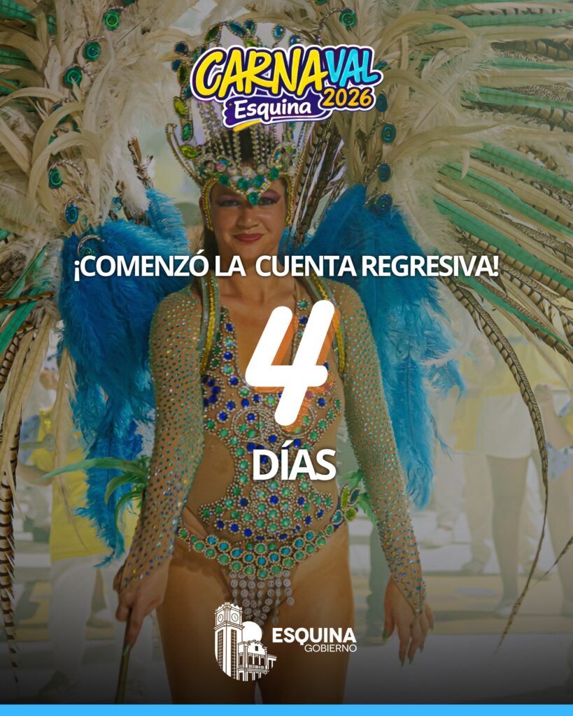 - Municipalidad de Esquina Carnavales CO.MU.CA.E Carnaval 2026 | Faltan 4 días 27 enero, 202627 enero, 2026 Municipalidad de Esquina 0 comentarios En 4 días, la pasión, el brillo y la alegría vuelven a las calles