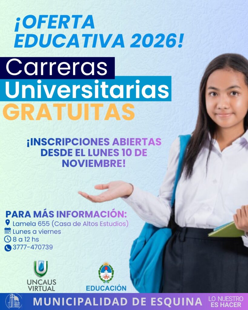 Acercate a la Casa de Altos Estudios (Lamela 655), Oficina de Dirección de Educación, de lunes a viernes de 8 a 12 h.