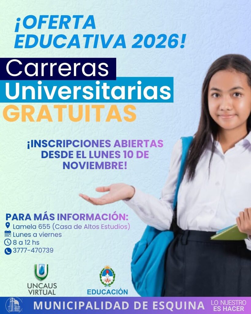 Acercate a la Casa de Altos Estudios (Lamela 655), Oficina de Dirección de Educación, de lunes a viernes de 8 a 12 h.