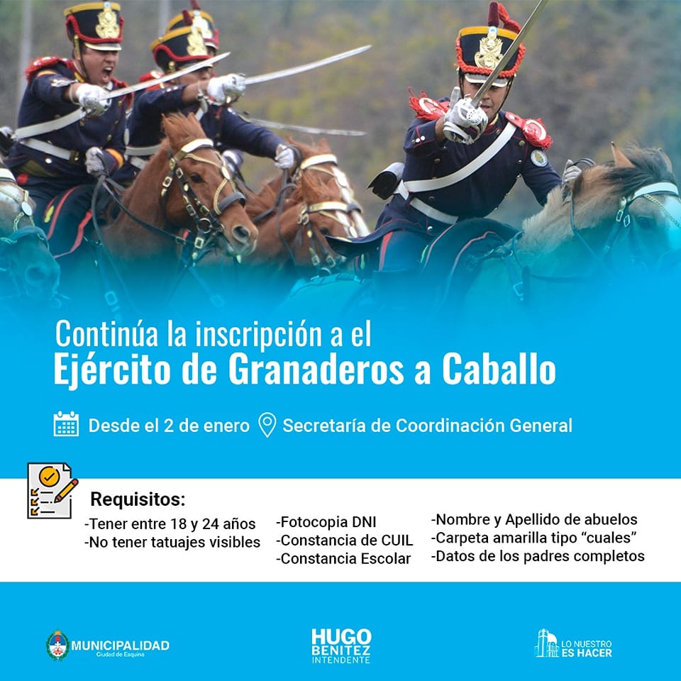 - Municipalidad de Esquina Continúa abierta la inscripción a el Ejército de Granaderos a Caballo 28 diciembre, 202212 enero, 2023 Municipalidad de Esquina A partir del 2 de enero podrás acercarte a la Oficina de de la Secretaría de Coordinación General. Compartí la info a quién pueda servirle.