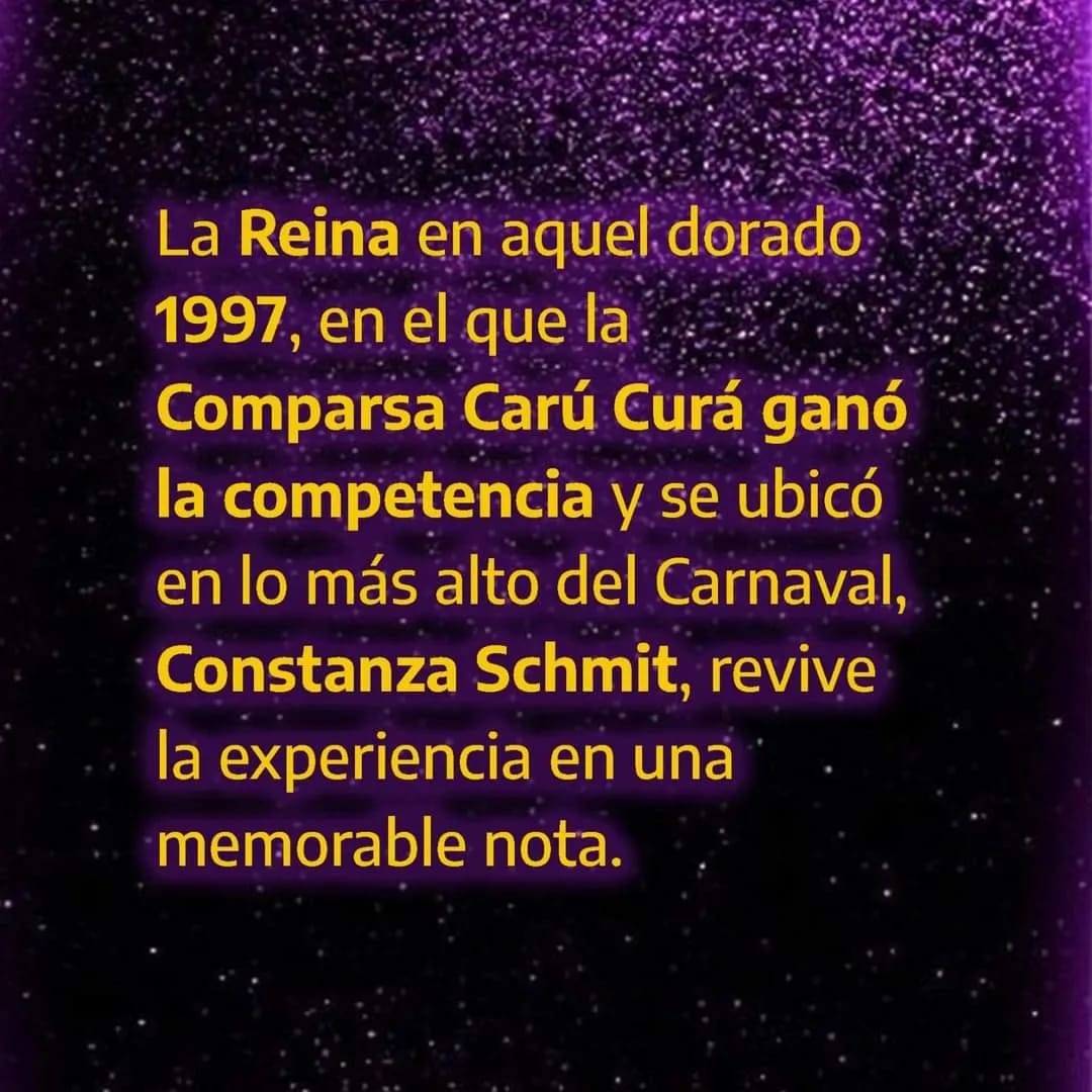 La Reina en aquel dorado 1997, en el que la Comparsa Carú Curá ganó la competencia y se ubicó en lo más alto del Carnaval, Constanza Schmid, revive la experiencia en esta memorable nota.