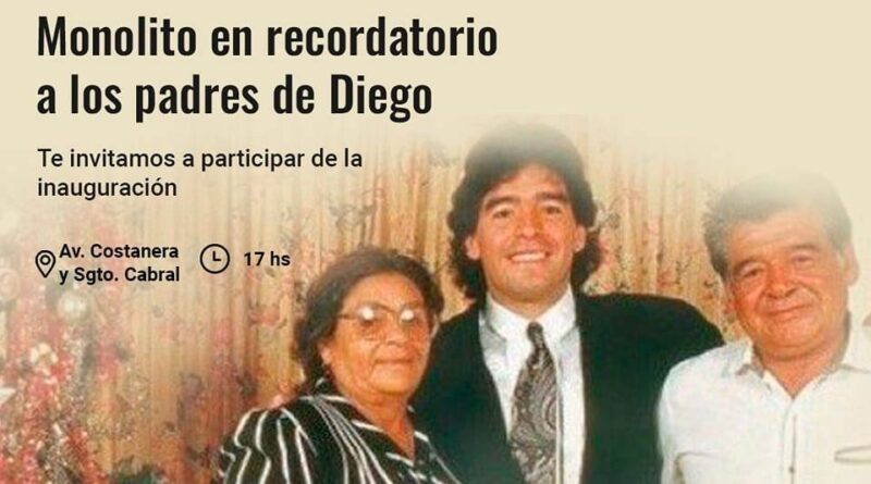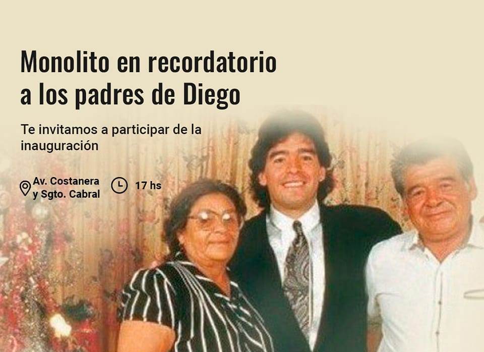Invitamos a la inauguración del Monolito recordatorio a los padres de Diego Maradona en la Av. Costanera y Sgto. Cabral, en el lugar donde vivían los padres y las hermanas de Diego.