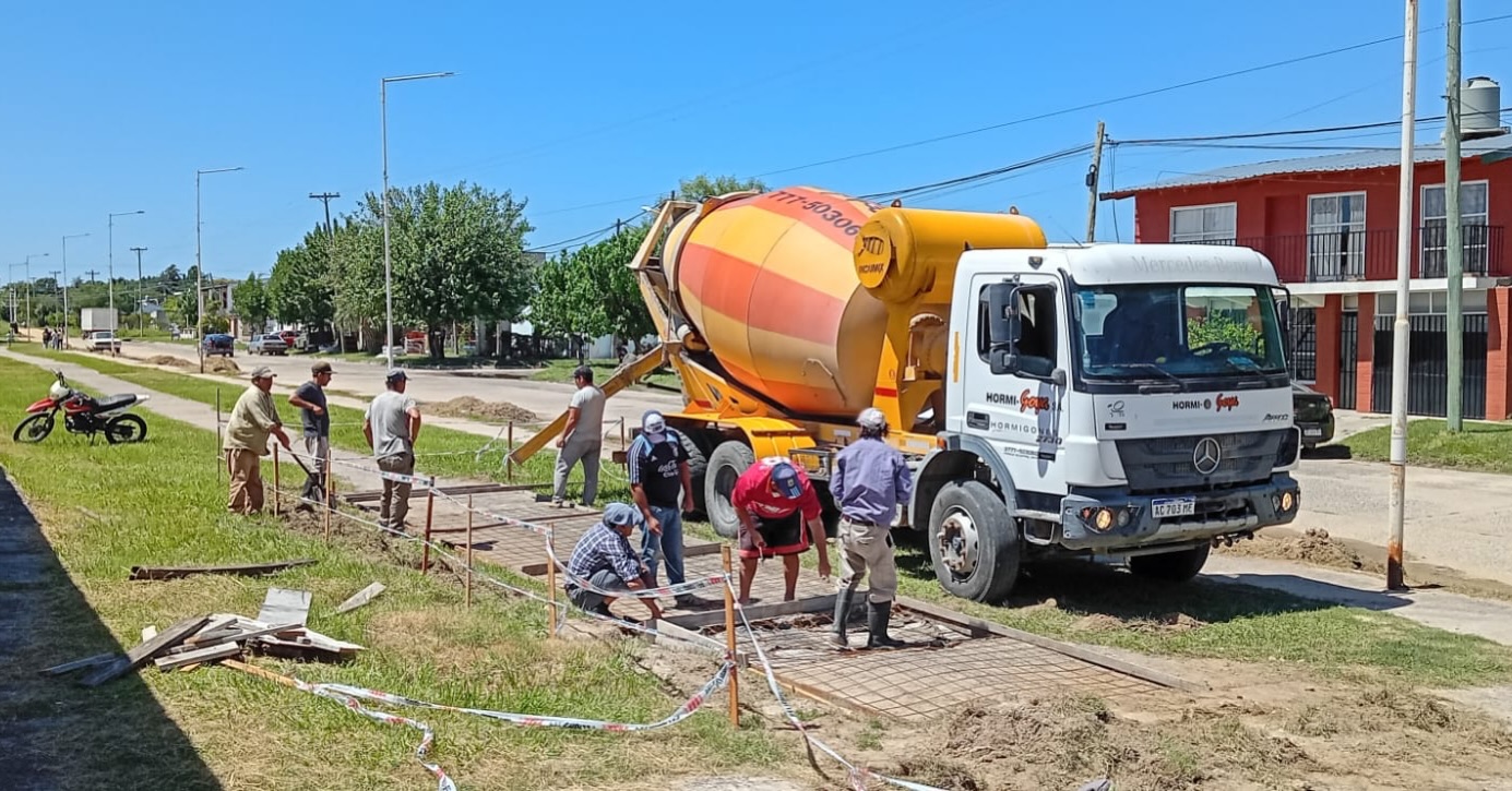Avanzan los trabajos de mejoramiento de veredas sobre calle Hipólito Irigoyen, con tareas de hormigonado que buscan mejorar la circulación y la seguridad peatonal.