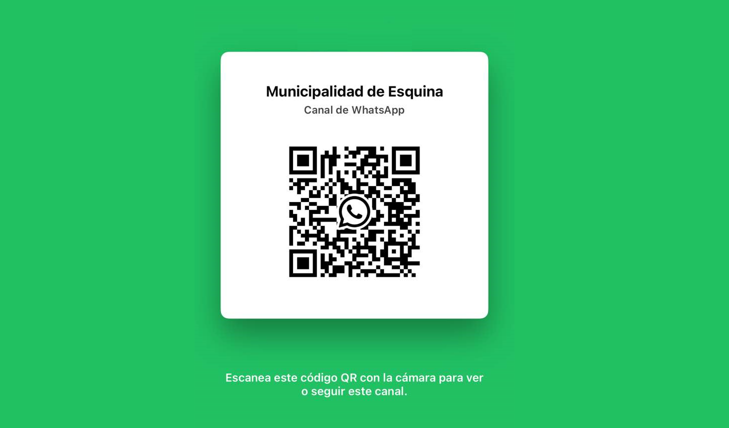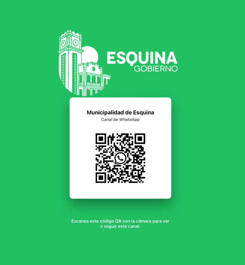 - Municipalidad de Esquina Municipalidad de Esquina | Canal Oficial de WhatsApp 18 diciembre, 202522 diciembre, 2025 Municipalidad de Esquina Escaneá el QR y sumate a nuestro canal de WhatsApp, donde vas a recibir información oficial, avisos importantes, trabajos municipales y comunicados de cada área. Información clara, directa y por los canales oficiales. Te invitamos a sumarte y mantenerte informado.