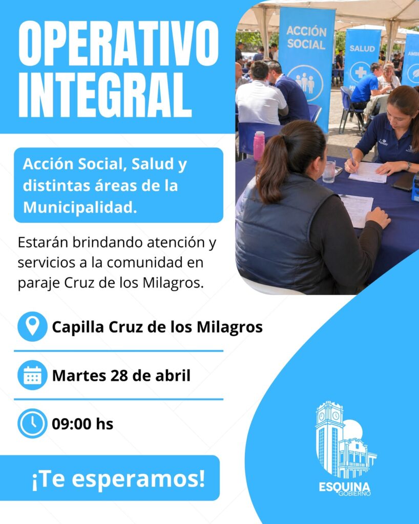 Este martes 28 de abril estaremos en la Capilla Cruz de los Milagros desde las 09:00 hs, acercando atención, acompañamiento y servicios a los vecinos junto a Acción Social, Salud y distintas áreas de la Municipalidad.
