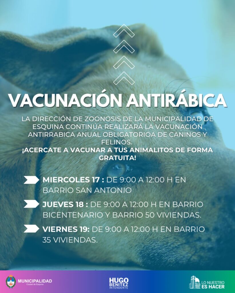La Dirección de Bromatología y Zoonosis de la Municipalidad de Esquina continúa con la campaña anual de vacunación obligatoria para caninos y felinos.