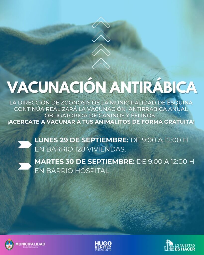 La Dirección de Zoonosis de la Municipalidad de Esquina continúa con la vacunación antirrábica anual obligatoria para caninos y felinos.